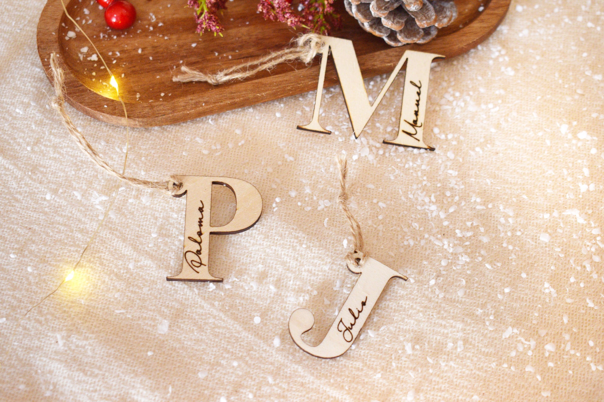 Dale un toque personal a tu árbol con este adorno de madera grabado con la inicial que elijas. Sencillo, elegante y lleno de encanto.