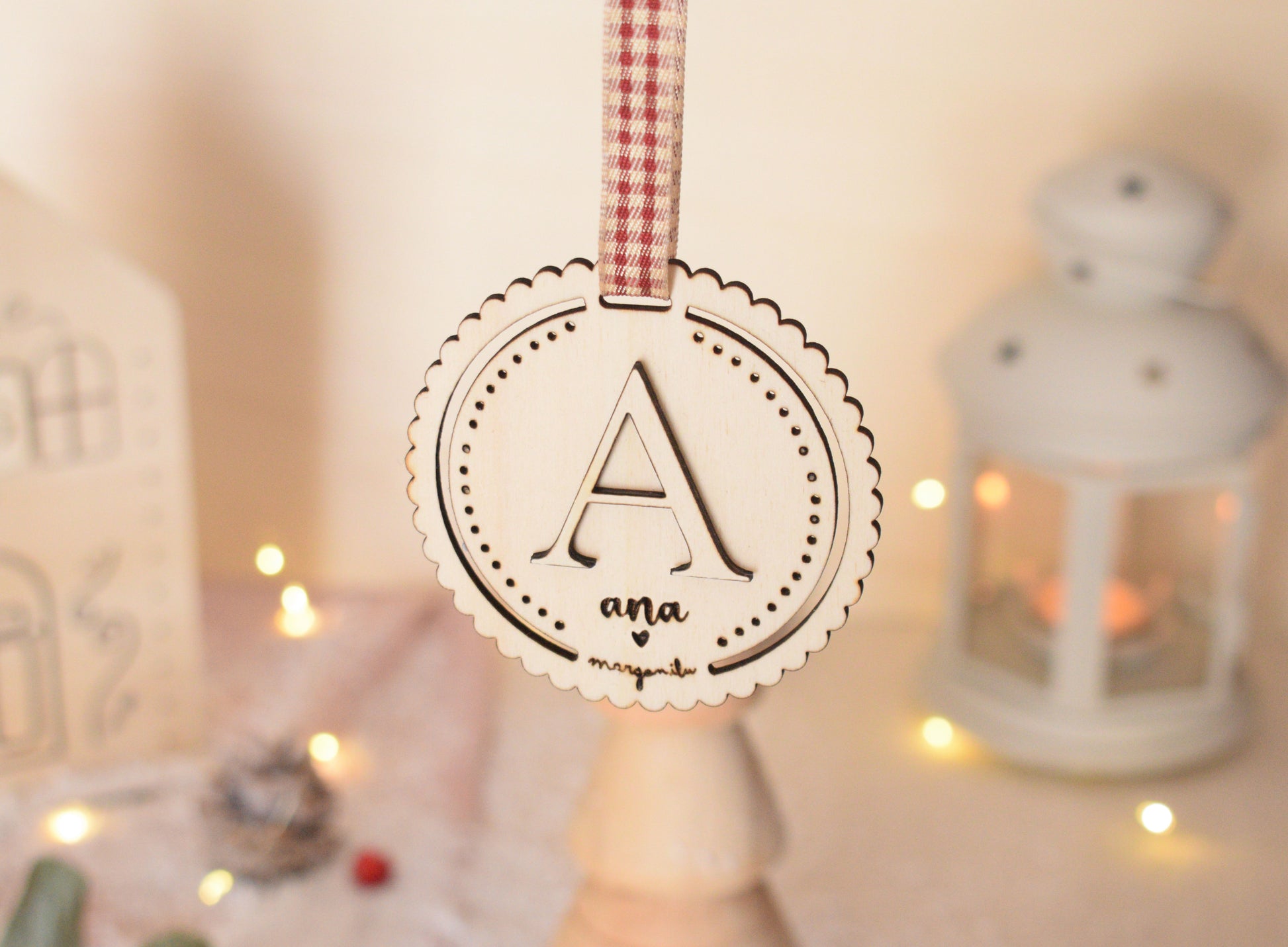 Dale un toque personal a tu Navidad con este adorno redondo de madera, perfecto para grabar la inicial de tu nombre o de quien más quieres. Un detalle sencillo, elegante y lleno de encanto para colgar en tu árbol o regalar.