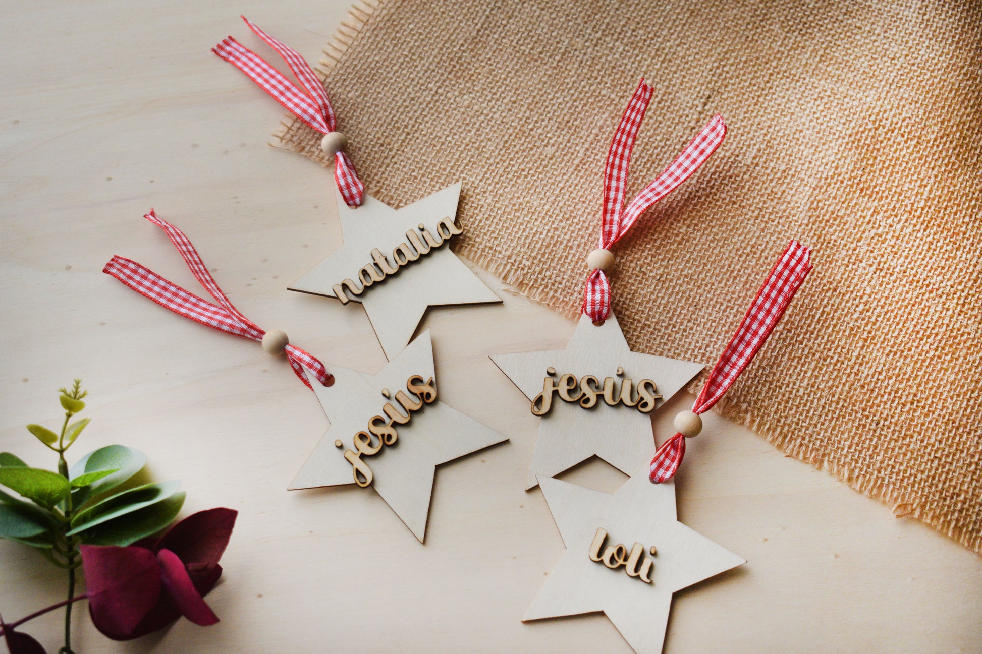 Dale un toque personal a tu árbol con esta estrella de madera grabada con el nombre que elijas. Elegante, sencilla y con un encanto especial que la hace única.
