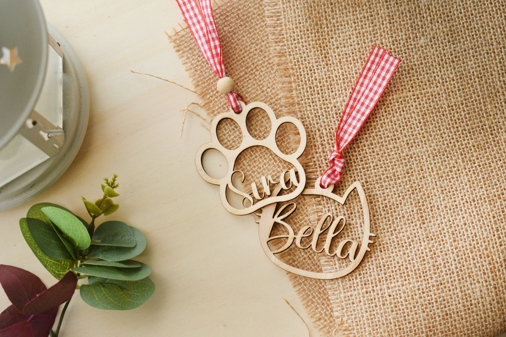 Celebra a tu compañero peludo con esta huella de madera calada. Ideal para colgar en tu árbol o rincón favorito, y personalizarla con su nombre o foto para un recuerdo único.
